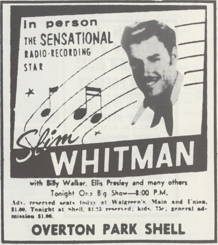 Acompanhado do guitarrista Scotty Moore e do baixista Bill Black, com quem gravara o single, Elvis subiu ao palco do auditório externo do Overton Park Shell, em Memphis, para abrir o show de Slim Whitman, cantor de country de sucesso nos anos 1950. No setlist, “That’s All Right, Mama” e “Blue Moon Of Kentucky”, as duas do compacto, e mais “I’ll Never Let You Go (Little Darlin’)”.