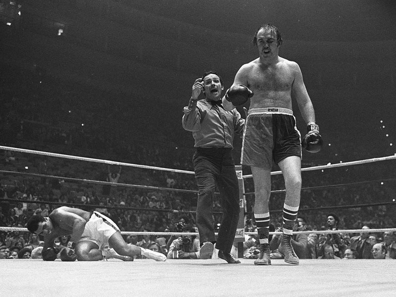 De repente, um cruzado de esquerda atinge o pescoço de Ali, seguido de um outro de direita, na região hepática. Ali estava no chão. O ginásio veio abaixo.