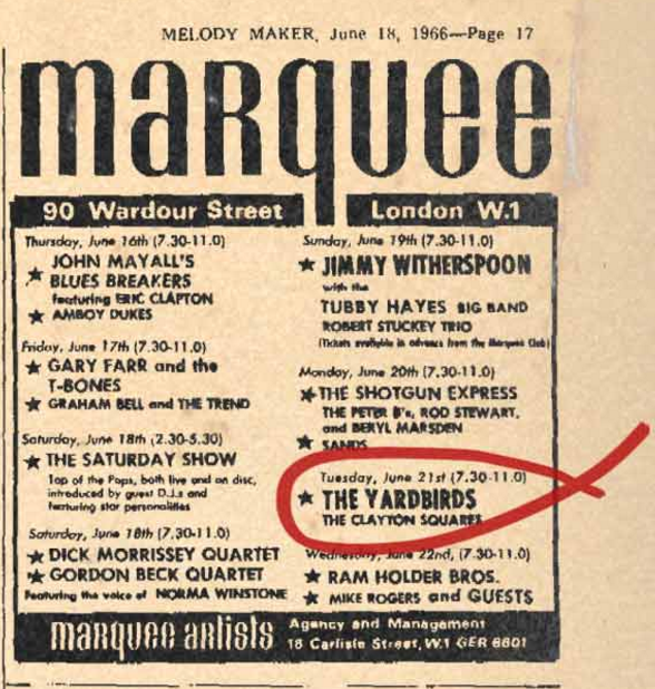 “Três dias depois do show em Oxford, neste dia em 66, os Yardbirds tinham data no Marquee Club de Londres e estavam sem baixista. Como Paul não ia voltar, eu me ofereci para tocar baixo com eles. Esta foi a minha estreia. Não foi uma tarefa fácil, a de preencher o papel realizado com enorme potência por Paul Samwell Smith, mas eu me saí bem”, relembra Page, em seu site oficial.