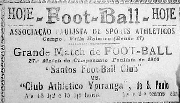 Naquele domingo de 22 de outubro de 1916, todos os caminhos na praia levavam ao “Campo do Santos”, no bairro da Vila Belmiro. O match contra o forte Clube Athletico Ypiranga era o primeiro no estádio, 10 dias depois da festa de inauguração.