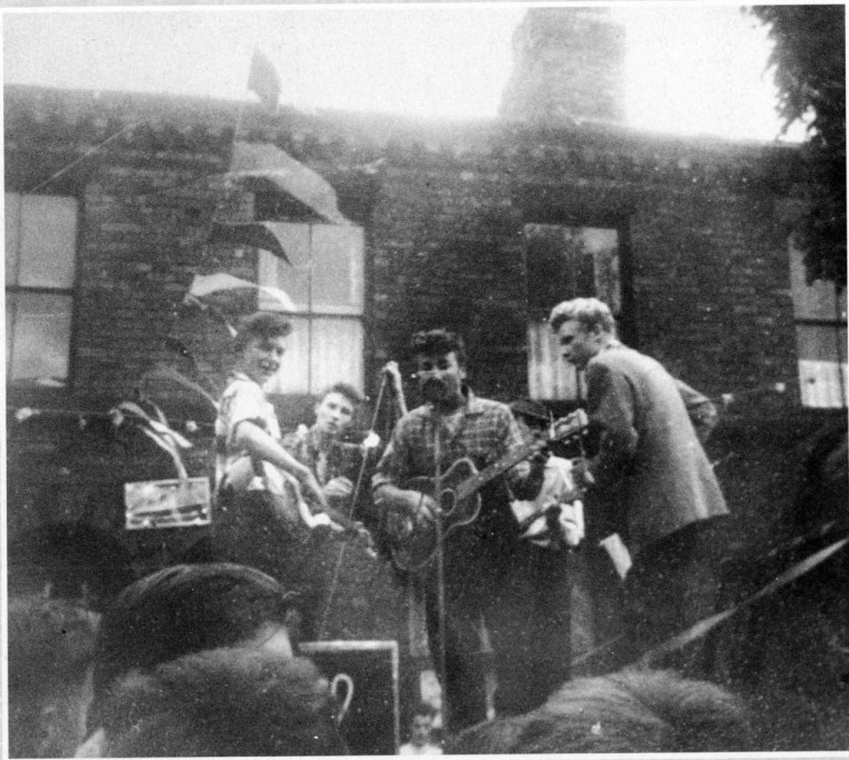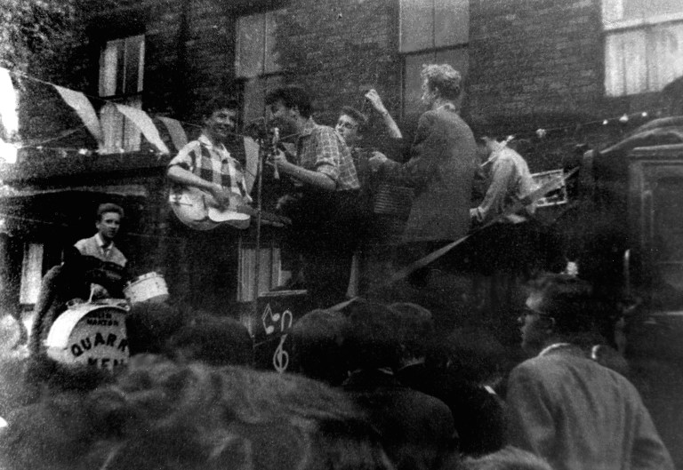 Em cima de uma caminhonete improvisada de palco na estreita ruela decorada com enfeites de bandeirinhas, John Lennon, Rod Davis (banjo), Len Garry (baixo), Eric Griffiths (guitarra), Pete Shotton (washboard, a tábua de lavar!) e Colin Hanton (bateria) se apresentaram pela primeira vez a um público de respeito.