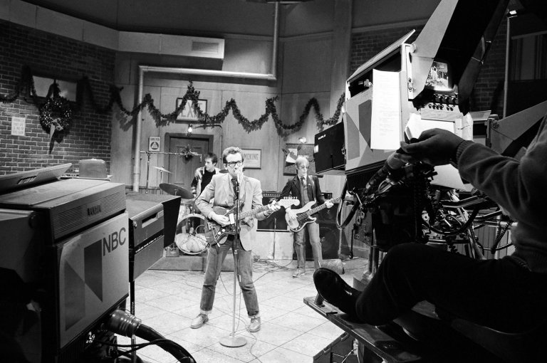Na foto: Costello e banda nos bastidores do Saturday Night Live, em 1977.