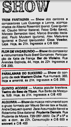 Os Paralamas fizeram os dois shows no Western Club, localizado no bairro do Humaitá, dos raros bares da época que já abriam espaço para a nascente geração de bandas de rock. Numa nota em que eram anunciados os shows pela cidade naquelas noites, o Jornal do Brasil de 30 de novembro noticiava: “Terça e quarta, no animado Western, às 21h30, estreia do jovem grupo de new wave intitulado Paralamas do Sucesso. Meio estranho o título, buzina não seria melhor?”. No repertório, um tanto de covers (The Who, Bob Marley, Police), outro tanto de canções gozadoras da pré-história da banda (“Pinguins”, “Rodei de novo”, “Vital e sua moto”, “Vovó Ondina é gente fina”, “Cínica” – nesta última, parceria obscuríssima com os amigos do Kid Abelha & Os Abóboras Selvagens, surpresa: Bi Ribeiro cantava, com a alcunha de “Cauby Ribeiro”).